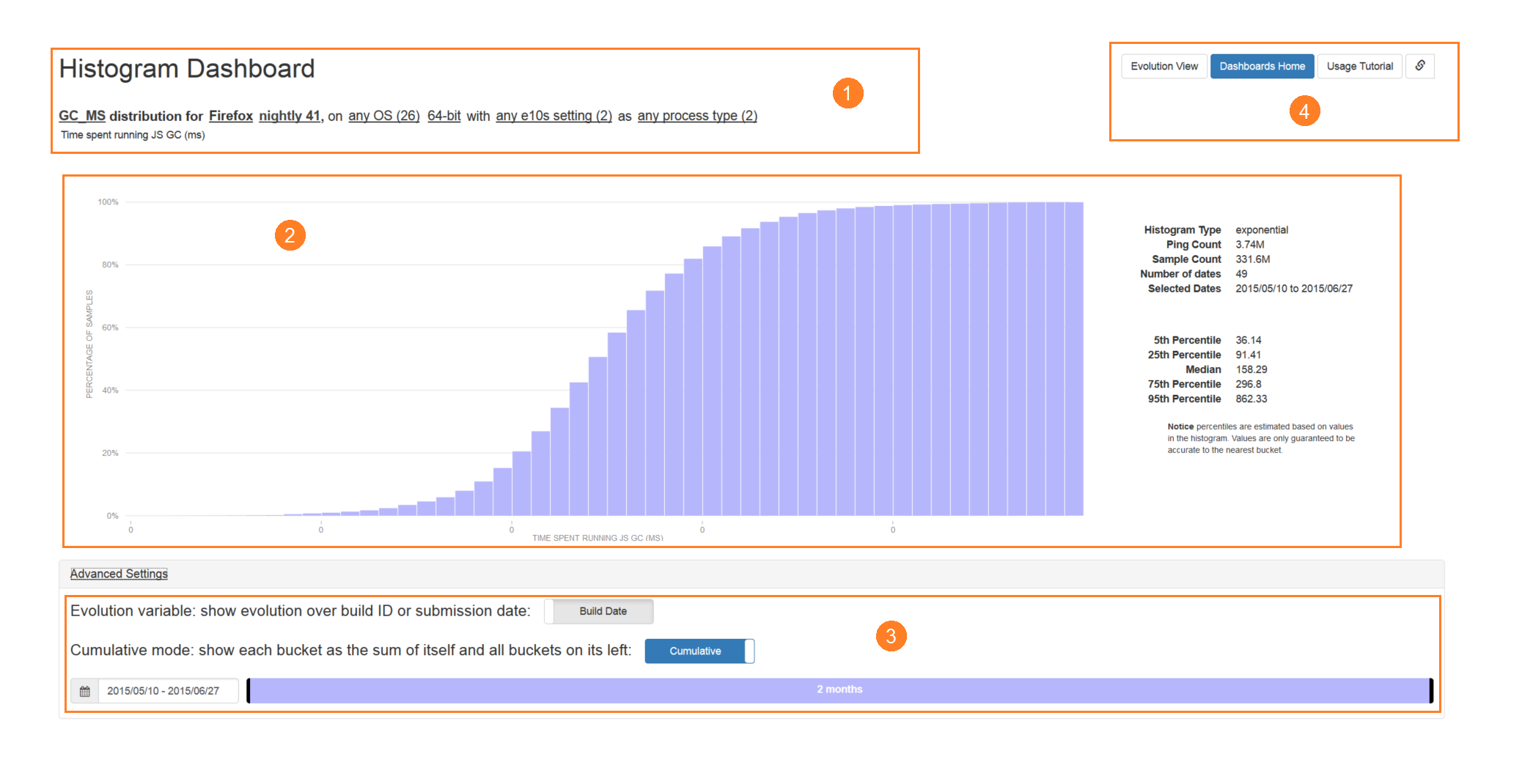 - The Distribution View button switches to the histogram dashboard, transferring all the filtering over where applicable. For example, if we are currently showing the evolution of GC_MS for Firefox 32-bit on Windows, then this link will take us to the histogram dashboard, showing the distribution of Firefox 32-bit on Windows.